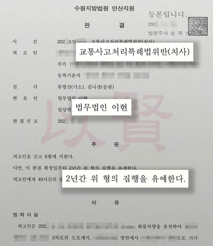 법무법인 이현은 교통사고 사망 사건에서 김철수 님이 실형을 면하고 집행유예를 받을 수 있도록 치밀한 전략을 세웠습니다.
