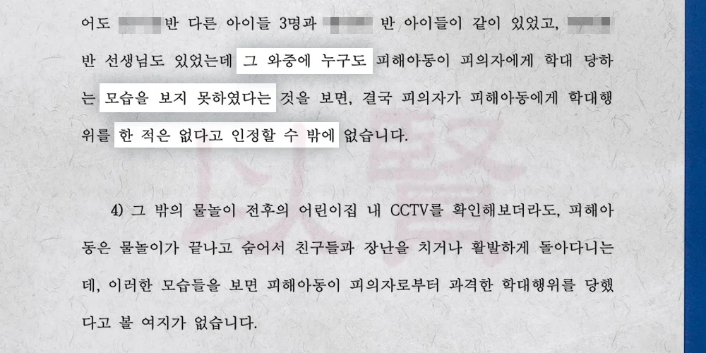 아동학대로 인정되려면 신체적 손상이나 정서적 학대가 있어야 합니다. 하지만 김 교사의 행위를 살펴보니 등원 돕기, 간식 주기, 체온 측정, 물놀이 함께하기... 등 모두 일상적인 보육 활동이었습니다.