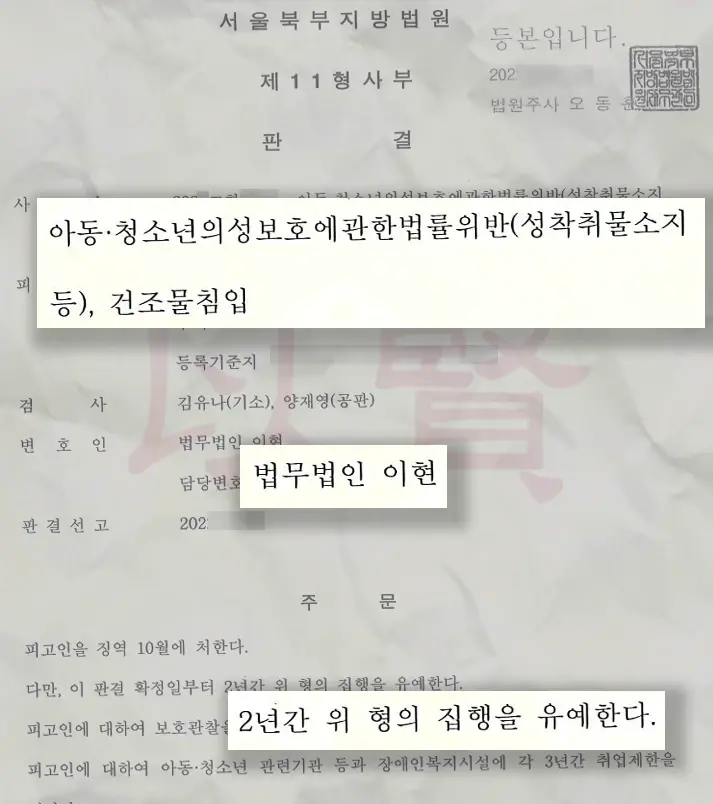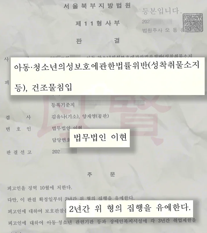 법원은 이현 변호인의 주장을 받아들여 박진우 씨에게 징역 10월에 집행유예 2년을 선고했습니다. 재판부는 건조물 침입이 우발적이었던 점과 소지한 아동 청소년 성착취물의 개수가 단 1개뿐인 점 그리고 피고인이 재범 방지를 위해 스스로 치료를 받는 등 진지하게 반성하고 있다는 점을 양형의 핵심 이유로 꼽았습니다. 특히 성폭력 처벌법에 따른 신상정보 공개 및 고지 명령이 면제되면서 사회적 매장 위기를 극복할 수 있었습니다.