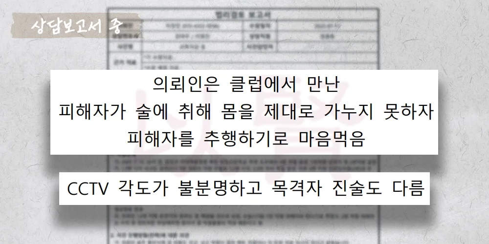 이 사건의 쟁점은 명확했습니다. “입으로 피해자의 신체를 접촉했다”는 진술이 있었지만, CCTV 각도상 그 행위가 실제로 있었는지는 불분명했습니다. 목격자 진술도 서로 달랐죠.