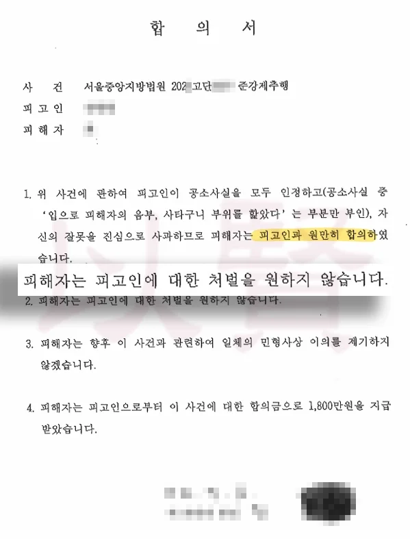 클럽 강제추행 사건: 피해자 측 국선변호인을 통해 합의금 1,800만원을 지급하고, 피해자는 “처벌을 원하지 않는다”는 의견서를 제출했습니다.