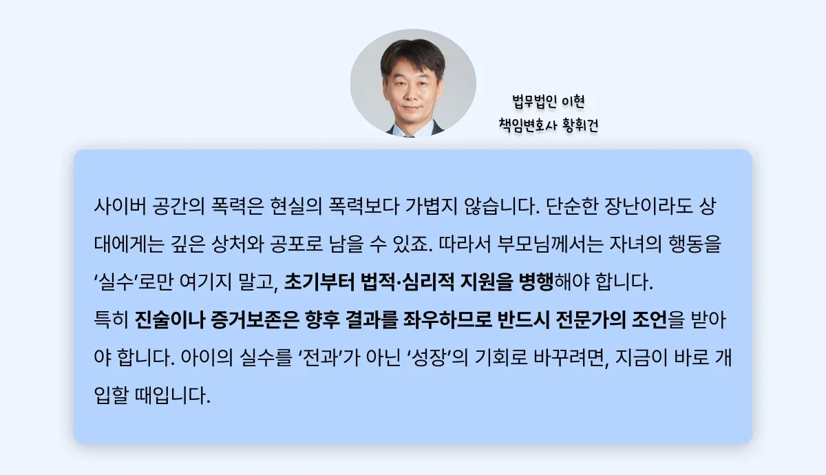 → 교육청·지자체에서 운영하는 ‘사이버폭력 예방교육’, ‘디지털 시민교육’ 프로그램이 있으며, 참여 시 선처에 도움이 되기도 합니다.