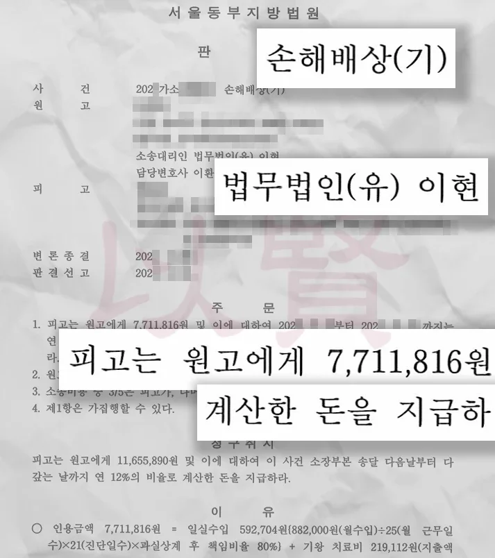 최종 종결: 피고의 책임 비율을 80%로 산정하여 총 7,711,816원을 지급하라는 판결이 확정되었고, 김민준 씨는 판결금(이자 포함)을 지급받아 사건이 성공적으로 종결되었습니다.
