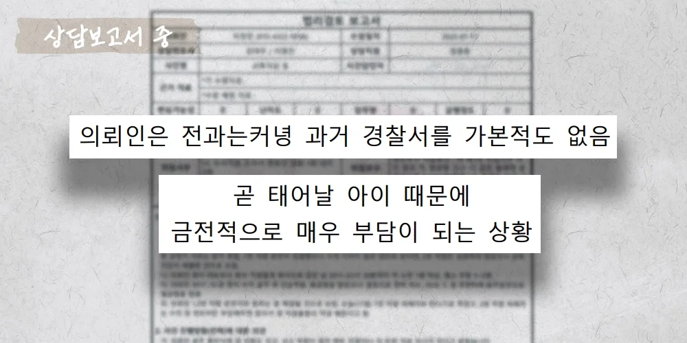 진술 중 불필요한 오해나 과장된 표현이 섞이지 않도록 자백할 부분과 부인해야 할 부분을 명확히 구분해 방향을 잡았습니다. 조사 후에는 반성문, 합의서, 진단서, 가족관계증명서 등을 첨부한 변호인의견서를 즉시 제출했습니다. 그 안에는 ‘피의자가 평소 질병으로 인해 불안정한 상태에서 순간적으로 범행에 이르렀다’는 사정과 ‘이미 피해가 완전히 회복되었다’는 근거가 함께 정리되어 있었습니다.