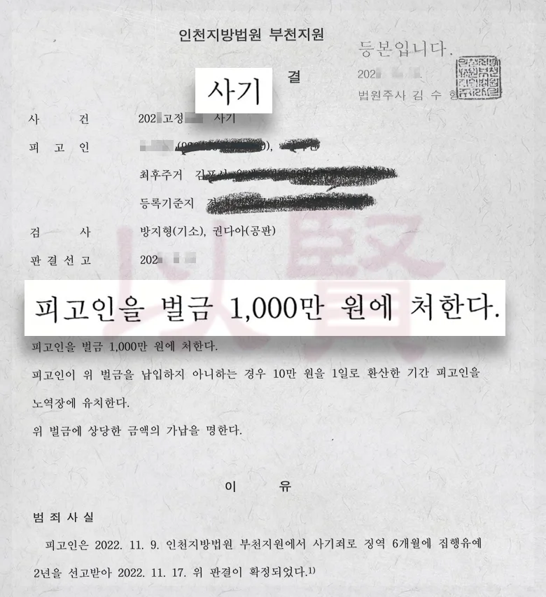 결국 이 사건은 애매한 투자 분쟁으로 끝난 게 아니라, 수사와 재판을 거쳐 사기라는 판단이 공식적으로 확인된 사건이었습니다. 의뢰인 입장에서는 무엇보다 동창이라는 관계를 빌미로 다가와 신뢰를 이용한 점이 너무 괘씸했고, 그래서 단순히 좋게 끝내는 게 아니라 반드시 처벌을 받게 하고 싶다는 의지가 강했습니다. 그 결과 피고인에게 벌금 1,000만 원이 선고되면서, 의뢰인이 원하던 대로 가해자가 실제로 벌을 받는 결과까지 이끌어낼 수 있었고, 의뢰인도 이 부분에 대해 이 정도라도 처벌이 확실히 나와서 마음이 놓이고 만족한다고 말씀하셨습니다.