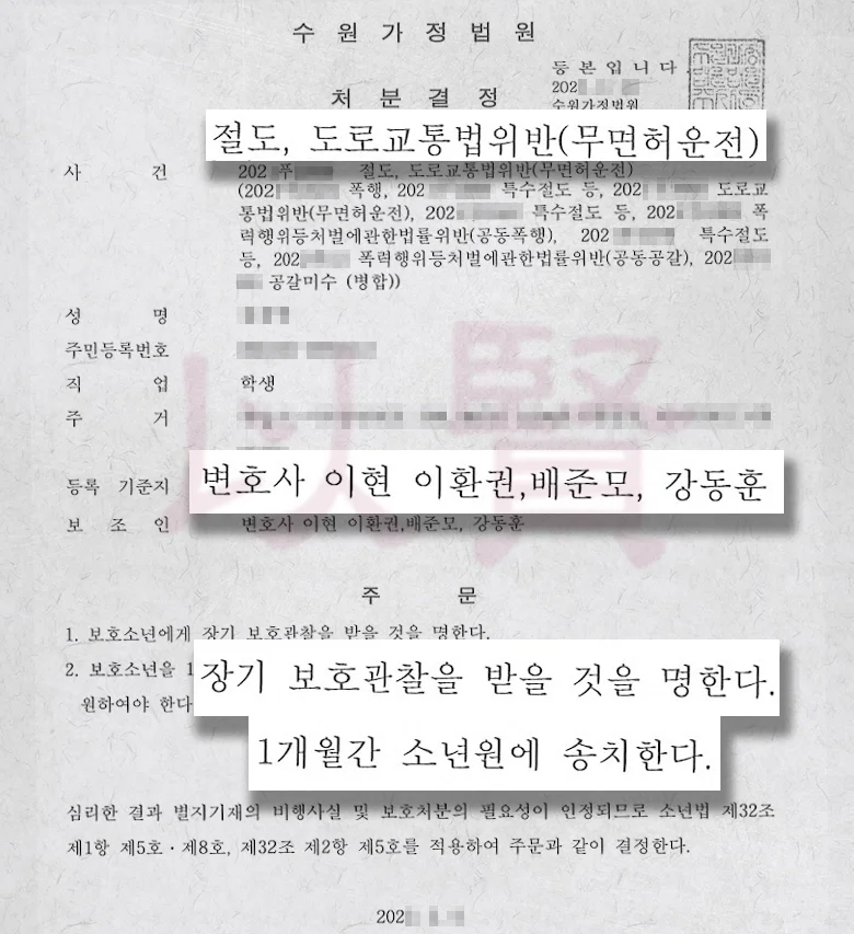 또 다른 사건에서는 친구들과 함께 피해자를 협박해 돈을 요구하다 공갈미수죄로 입건되었습니다. 짧은 기간의 방황이었지만, 법적으로는 매우 복합적이고 심각한 비행청소년 사건이었습니다.