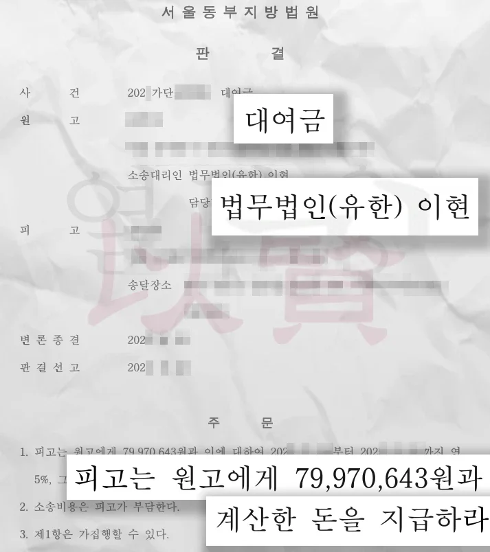 둘째, 민사 소송 승소 (돈을 돌려받게 되다) 형사 고소와 동시에 진행한 대여금 반환 소송에서도 법원은 A씨의 손을 들어주었습니다. 서울동부지방법원은 "피고(B씨)는 원고(A씨)에게 79,970,643원과 이에 대한 지연손해금을 지급하라"는 판결을 선고했습니다.