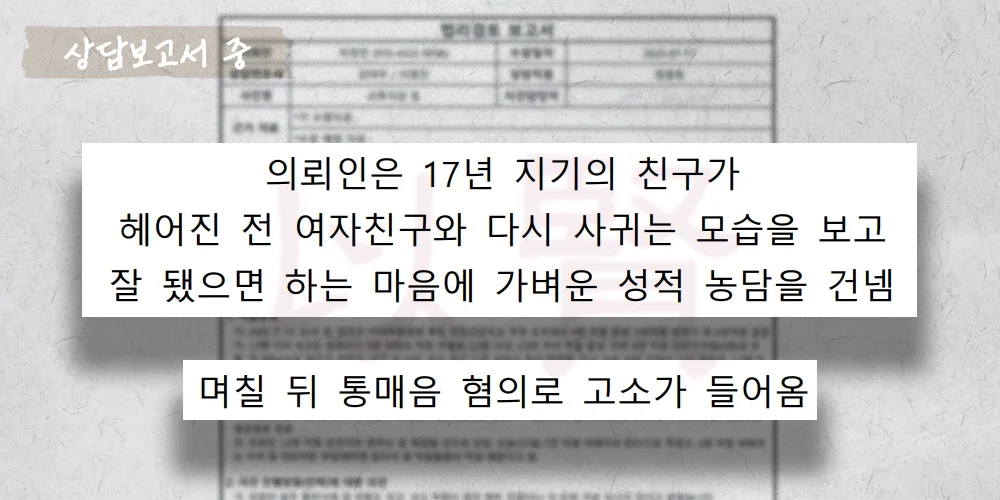 또한 문제의 메시지를 보낸 후에도 고소인은 ‘ㅋㅋㅋ’라는 웃음표시와 함께 여자친구가 볼 수 있으니 전화로 얘기하라며 불쾌감을 표시하지 않았던 점도 중요했습니다.