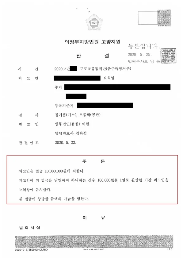 최종 판결 결과 : 벌금 1,000만 원