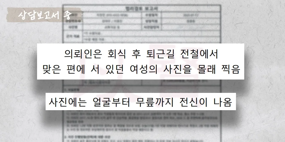 퇴근길 지하철. 술을 마시고 귀가하던 김 씨(가명, 37세)는 맞은편에 서 있던 여성의 사진을 아이폰으로 한 장 촬영했습니다. 얼굴부터 무릎까지 전신을 찍었습니다.