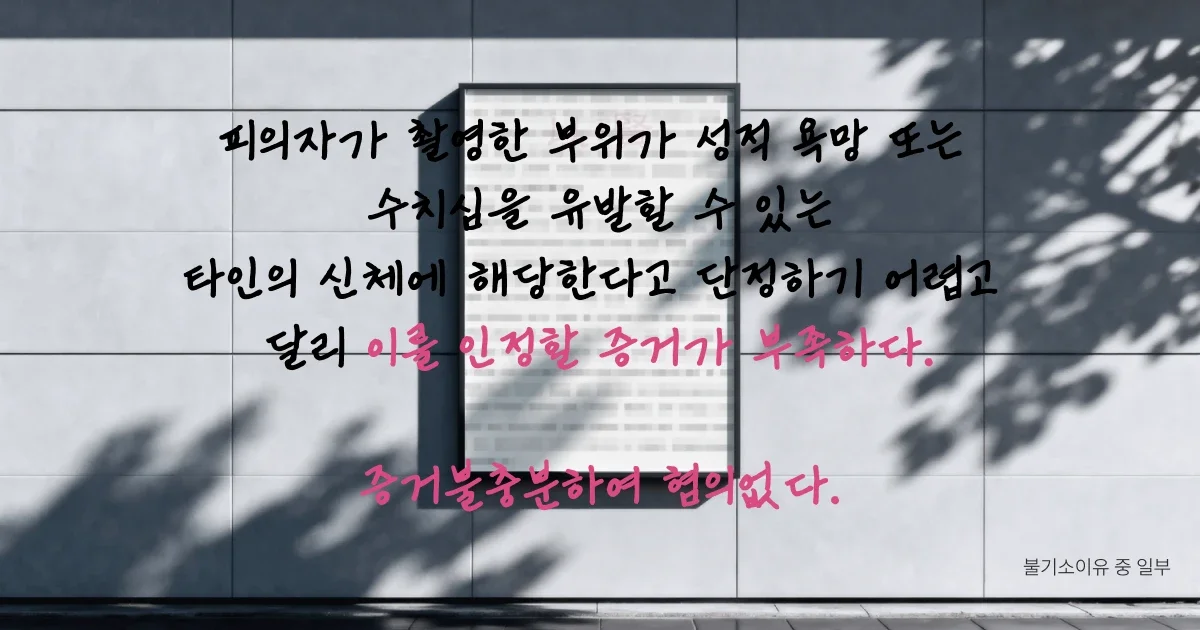 "촬영 장소는 지하철 내부였고, 피해자의 옷차림(긴팔 니트, 검정색 바지)이 신체 부위가 과도하게 노출된 옷차림으로 보기 어렵다. 촬영된 부위가 성적 욕망이나 수치심을 유발할 수 있는 신체에 해당한다고 단정하기 어렵고 이를 인정할 증거가 부족하다."