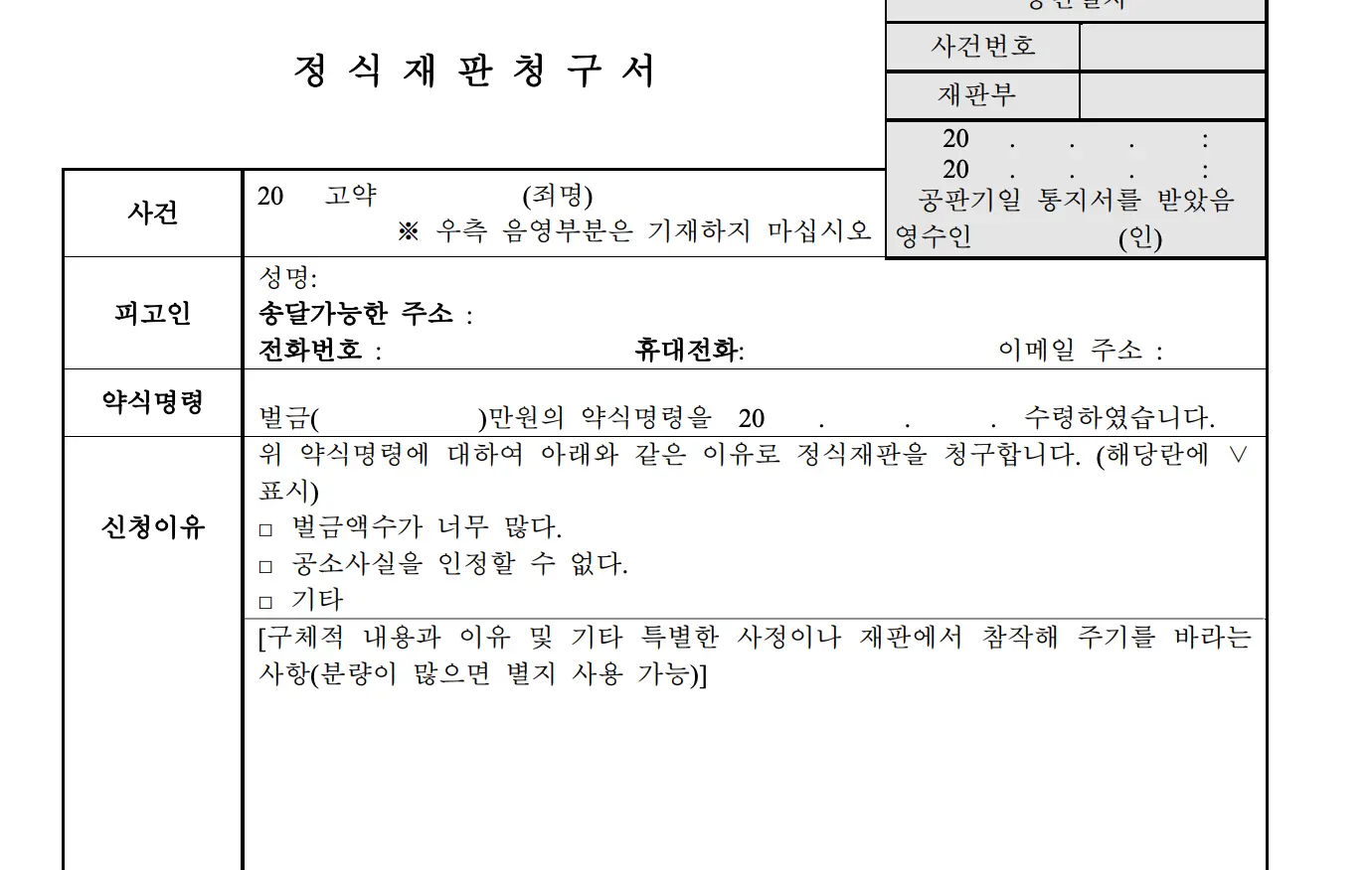 정식재판 청구는 반드시 서면으로 해야 합니다. 약식명령을 발령한 법원에 제출합니다. 청구서에는 다음 내용이 포함되어야 합니다: